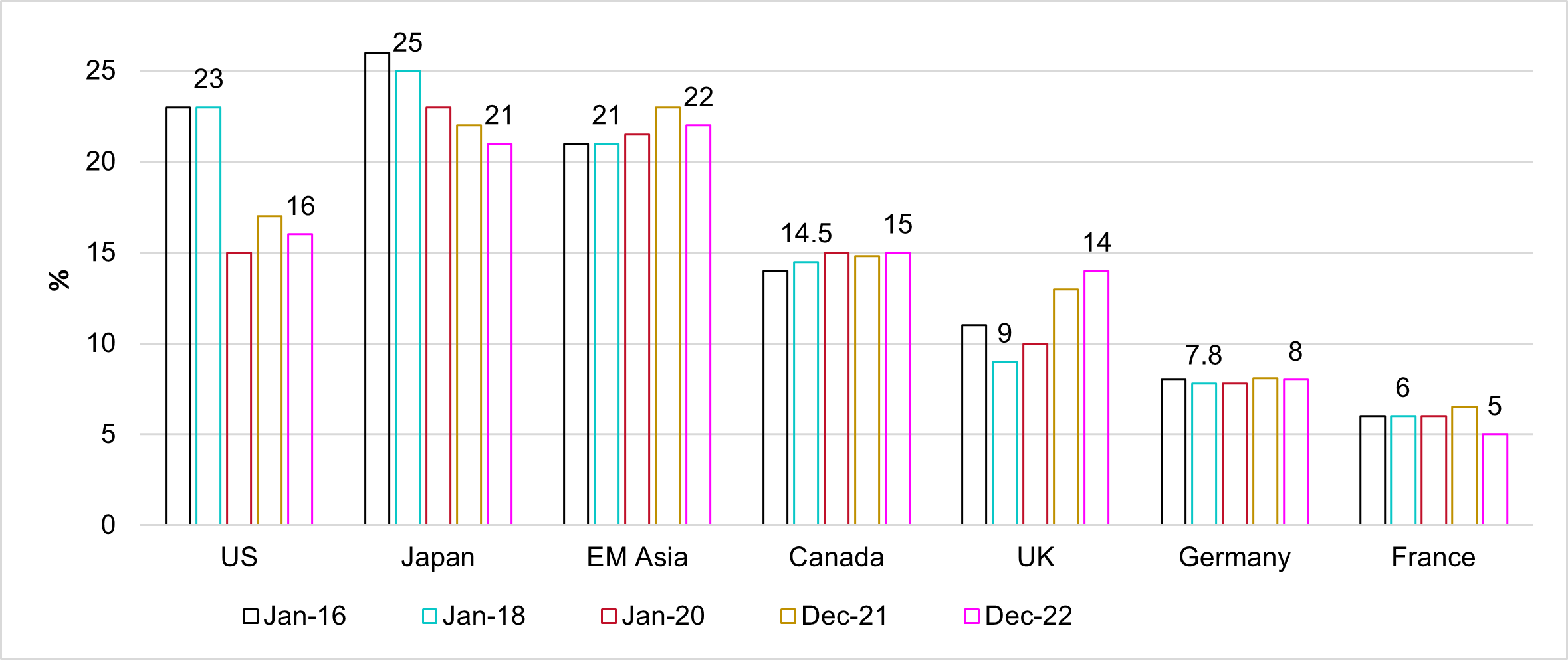 However, in recent years, the Chinese government has implemented stringent regulations on foreign investments and the expansion of overseas companies in China. Consequently, an increasing number of investors are now contemplating leaving the country, with many having already divested from their Chinese holdings. As shown in Graph 1, in 2022, foreign investment in China amounted to just 1% of the GDP, marking the lowest level in 25 years, and projections for 2023 suggest it will remain below 1%.