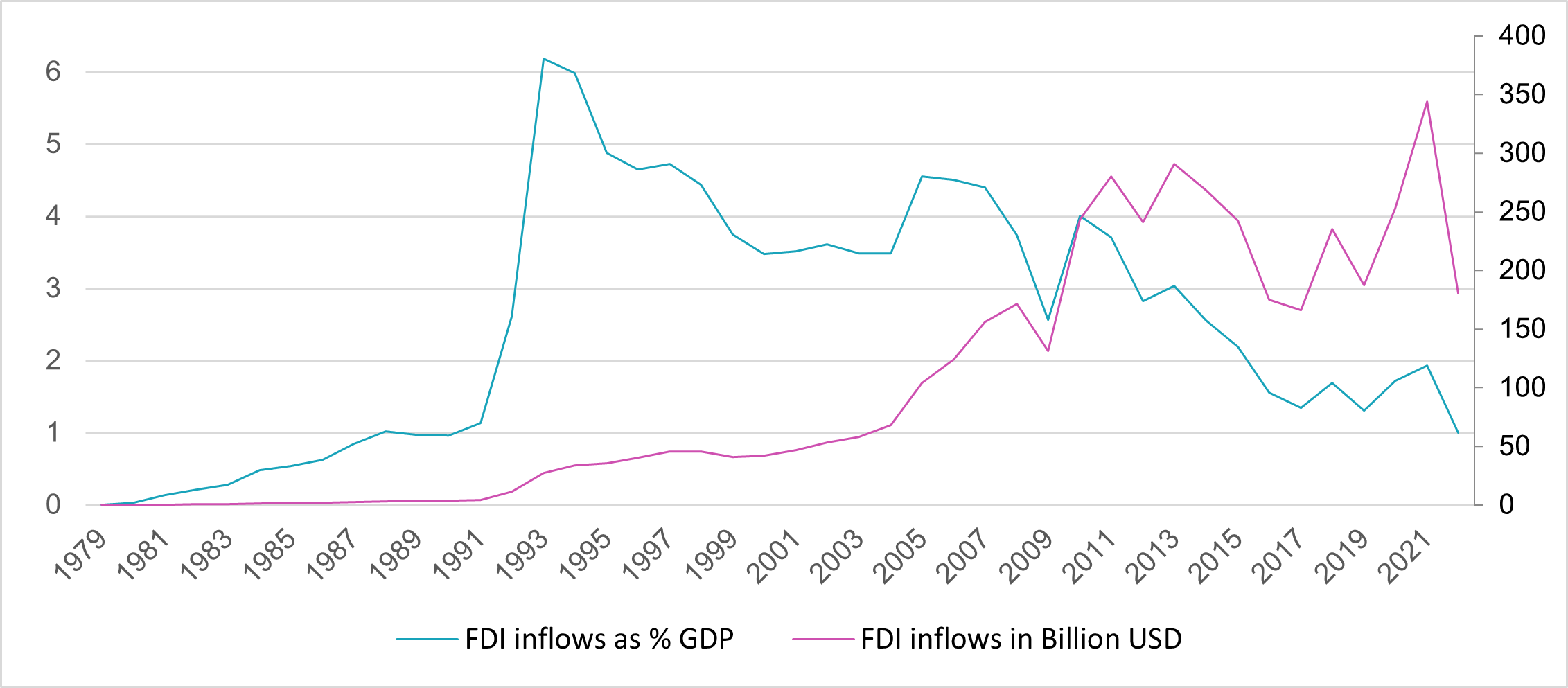 Graph 1. Foreign Investment in China (% of GDP) 1979 -2022